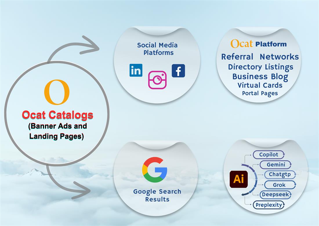 Multiple Banner Ads and Landing Pages will be created in an Online Catalog which will be distributed through Search engines, Social Media, Referral Networks, Ai Assistants and Ocat Marketing Portals.